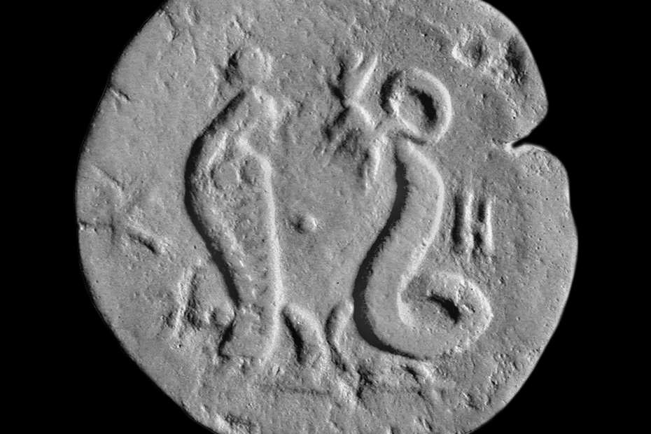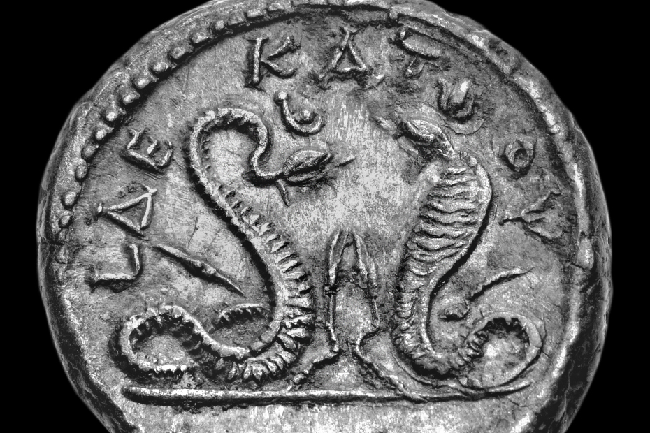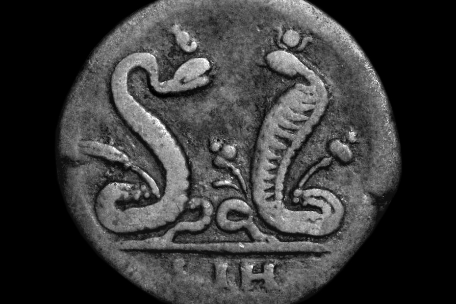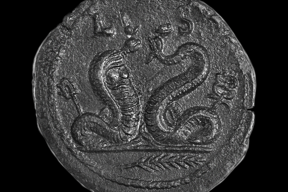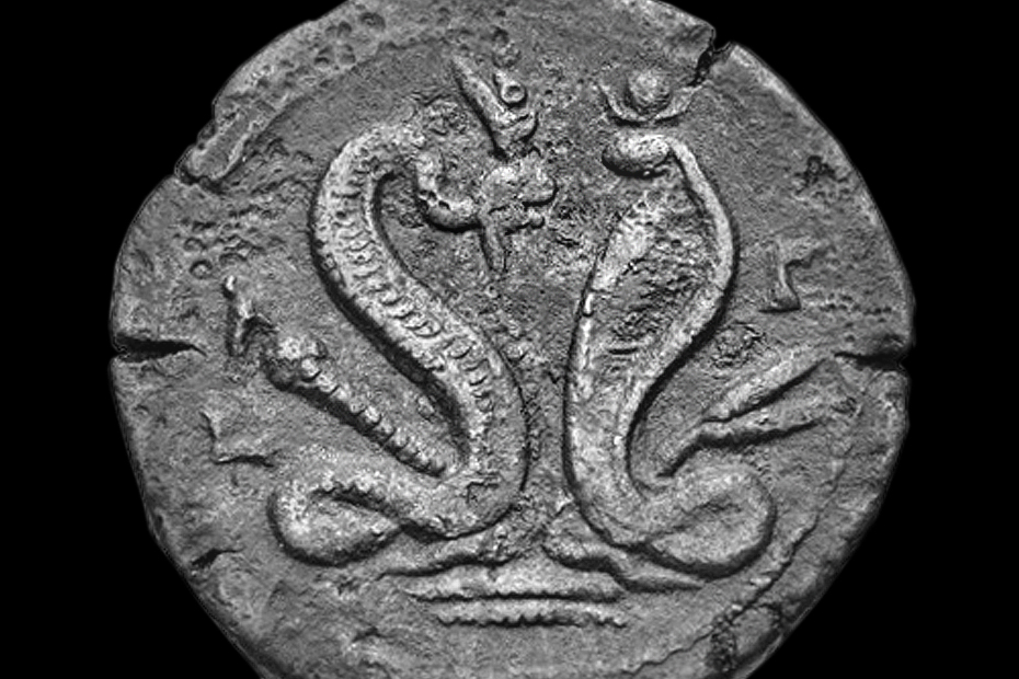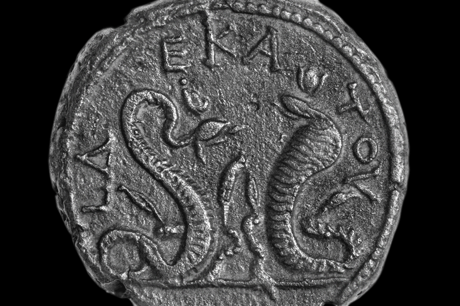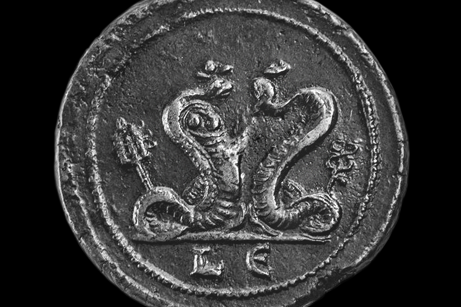 | Set III-2-aga-003. In ancient Greek religion, Agathodaemon was "good spirit" of vineyards and grainfields. It was also a personal companion spirit, comparable to the Roman genius, who ensured good luck, health, and wisdom. It was customary to drink or pour out a few drops of unmixed wine to honor him in every symposion or formal banquet. Agathodaemon was the spouse or companion of the goddess Tyche Agathe ("Good Fortune"). Agathodaemon was more prominent in traditional folk beliefs than in Greek mythology.