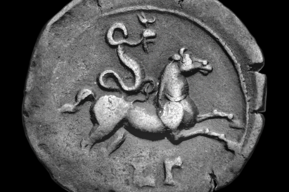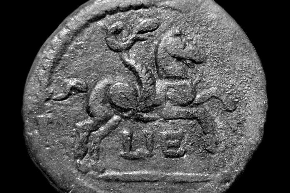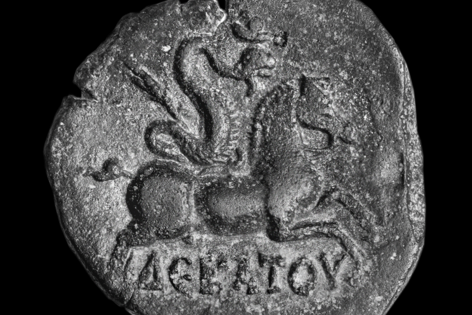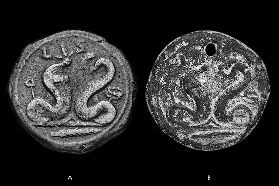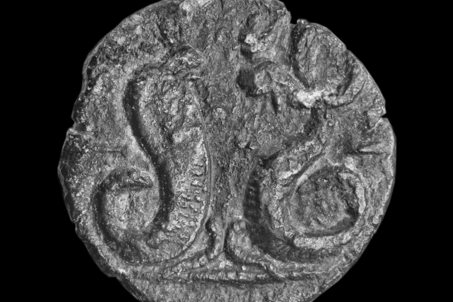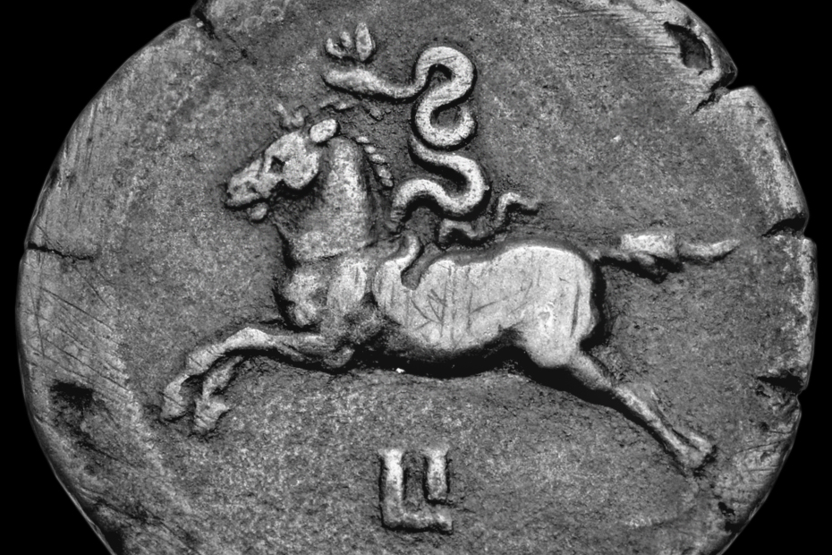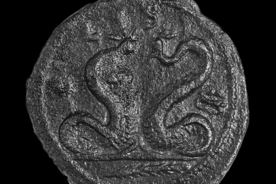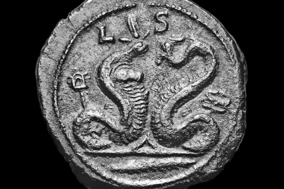| Set III-2-aga-003. In ancient Greek religion, Agathodaemon was "good spirit" of vineyards and grainfields. It was also a personal companion spirit, comparable to the Roman genius, who ensured good luck, health, and wisdom. It was customary to drink or pour out a few drops of unmixed wine to honor him in every symposion or formal banquet. Agathodaemon was the spouse or companion of the goddess Tyche Agathe ("Good Fortune"). Agathodaemon was more prominent in traditional folk beliefs than in Greek mythology.